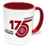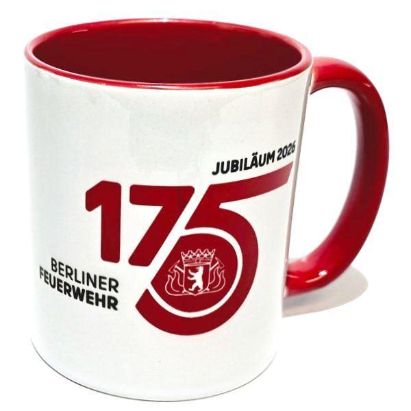 Tasse mit dem 175 Jahre Berliner Feuerwehr Logo und der Wort-Bildmarke auf der Rückseite.