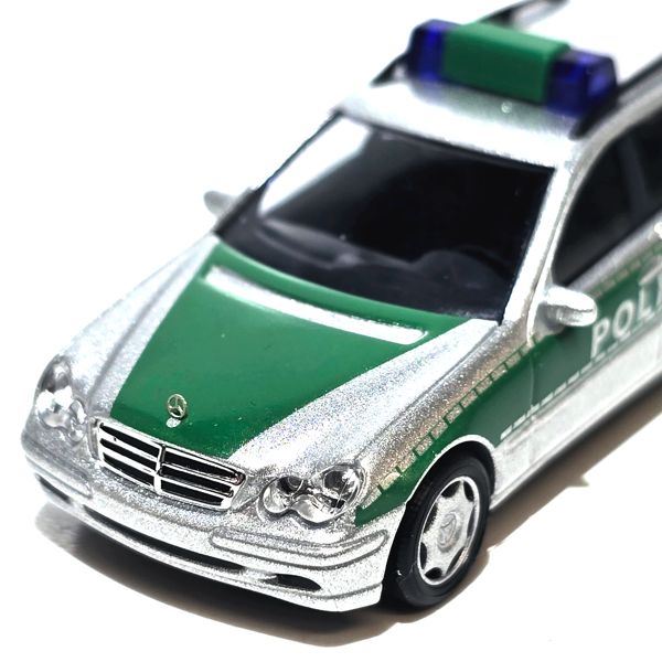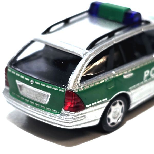 Modellauto des Mercedes-Benz C-Klasse T-Models als Einsatzfahrzeug der Polizei in grün.